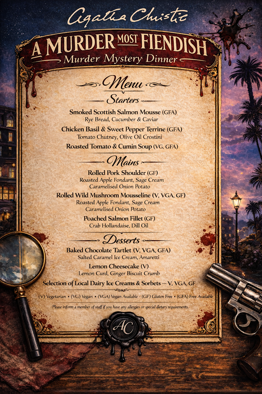 Please note: We have a capacity limit on tickets, and from our previous murder mystery events they do sell very fast and are subject to availability.