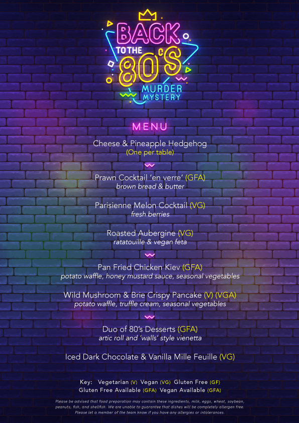 Step back in time to the electrifying 1980s for a night of mystery, mayhem, and murder — where big hair, bold fashion, and even bigger secrets set the stage for an unforgettable whodunit!