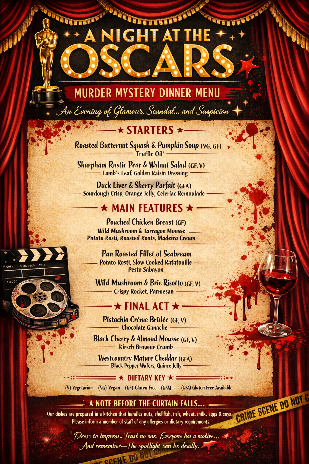 An Oscars inspired murder mystery dinner with live actors, three courses, and welcome drink.